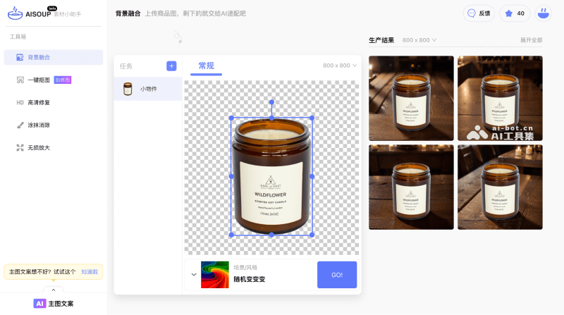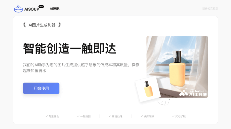 AI速配(AiSoup)是一个简单高效的AI图片处理工具箱,集背景融合、一键抠图、高清修复、涂抹消除、无损放大等多种AI功能于一体。该AI图片合成工具兼具性价比和操作便捷性,让用户在处理图片时如行云流水,轻松驾驭各种创意需求。