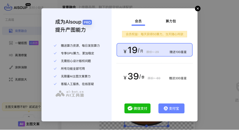 AI速配AiSoup根据算力点来进行图片处理,背景融合消耗10点、一键抠图消耗5点、高清修复消耗5点、涂抹消除消耗5点、无损放大消耗5点、主图文案限时免费