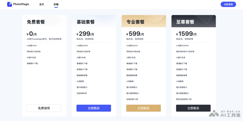 - 基础套餐:299元每月,提供30000 AI点数、可同时执行5条任务、AI图片生成、普通和高清图片下载、智能替换背景、AI消除笔、图片高清放大、购买加油包享8折等权益