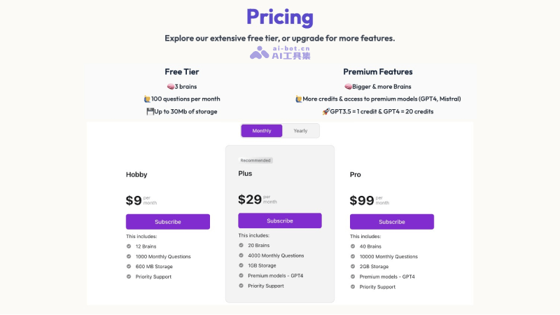 - Hobby版:9美元每月,构建12个知识库、每月1000个问题、600Mb存储空间