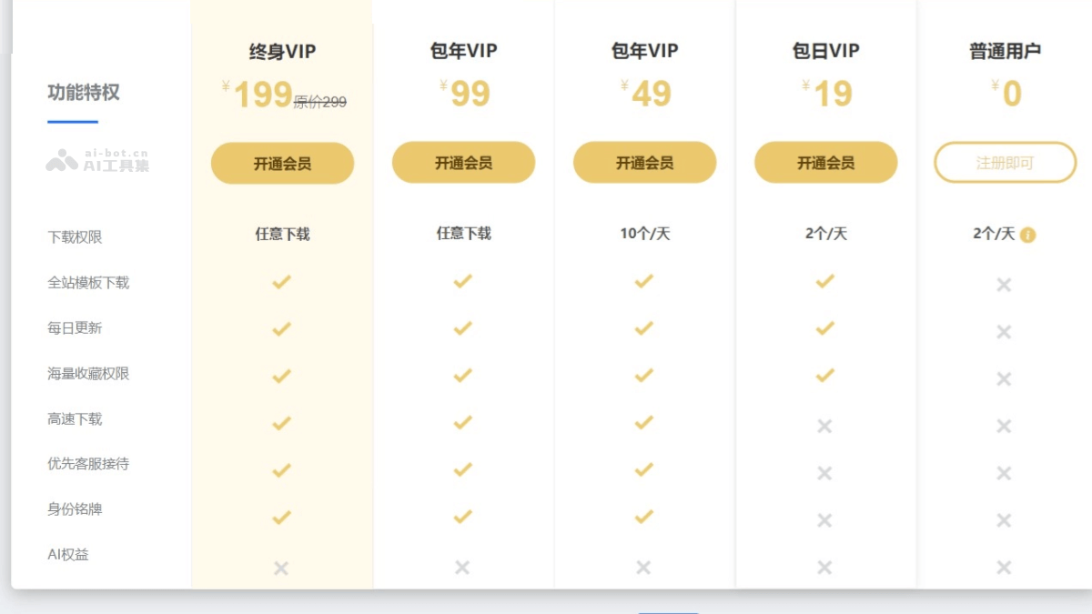 - 包年VIP:¥49。全站模版下载10个/天;享包日会员所有功能。