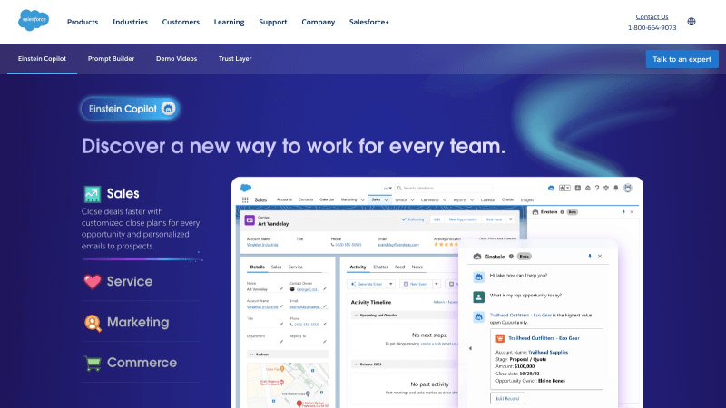 - Einstein for Service:帮助客户支持团队自动预测和填充案例字段来加速问题解决,减少重复任务,并通过实时数字渠道(如网页、移动聊天或消息)高效处理常规客户请求。