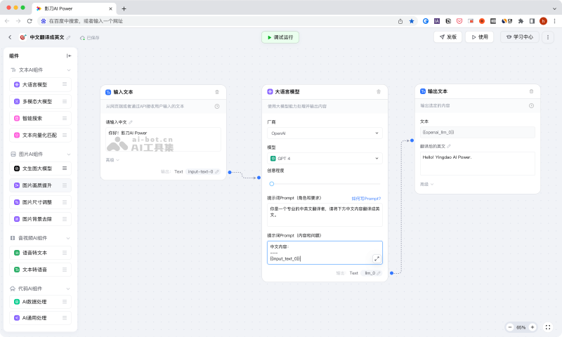 - 丰富AI组件预置:提供多种预设的AI组件,如自然语言处理、图像识别等,供用户快速使用。