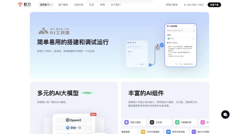 影刀AI Power是RPA软件影刀推出的一款面向企业的无代码AI开发工具,旨在简化企业接入和应用AI技术的过程。该平台通过集成企业知识库、多元大模型和丰富的AI组件(如智能搜索、文生图、语音转文本等),提供了一个一体化的企业AI工作站。用户可以通过可视化界面,通过拖拉拽的方式,轻松创建符合特定业务需求的AI服务。此外,影刀AI Power还支持自定义工作流程设计,帮助企业整合内外系统,提升业务效率和决策质量。
