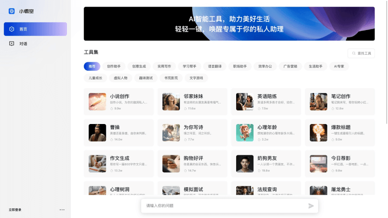 从其官网的展示来看小悟空除提供免费AI对话外,还提供了10余项分类的数十种智能工具,包括创作助手、创意生成、实用写作、学习帮手、语言翻译、职场助手、效率办公、广告营销、生活助手、AI专家、儿童成长、虚拟人物、趣味测试、书籍电影推荐等功能,以满足用户的工作、生活娱乐诉求。