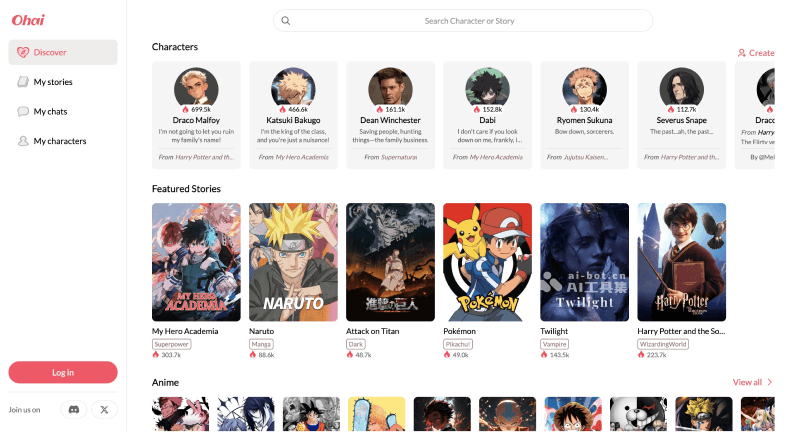 Ohai提供在线网页版、iOS和Android移动端应用以及Discord服务器,用户可以选择对应的平台登录注册后选择或创建AI角色进行对话。