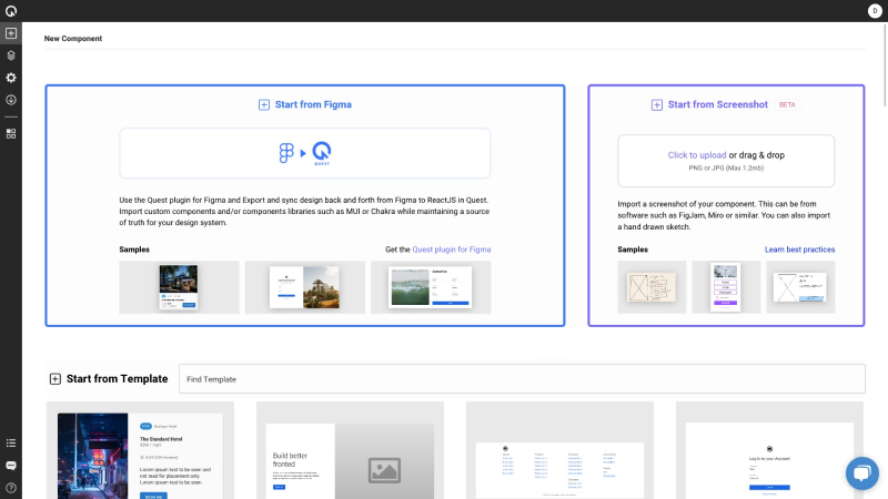 Quest AI 可以将 Figma 设计稿或者手稿转换为 ReactJS 前端代码,帮助设计人员或开发人员比以往更快地构建全栈网站应用程序。Quest 支持构建任何 ReactJS 组件,可以构建单个组件并将其添加到现有的 React 应用程序中,也可以使用 Quest 构建整个应用程序。