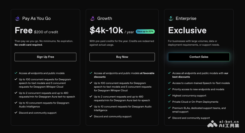 实际调用API时,会根据不同的模型和应用场景以及时长来计费,详情见Deepgram Pricing定价页面。