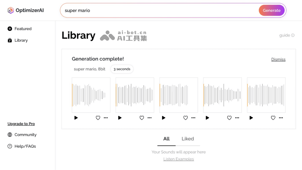 - 文本到声音效果生成:Optimizer AI可以根据用户的文字提示生成各种声音效果,适用于不同的场景和应用,如游戏中的射击声、跳跃声,动画中的环境音效等。