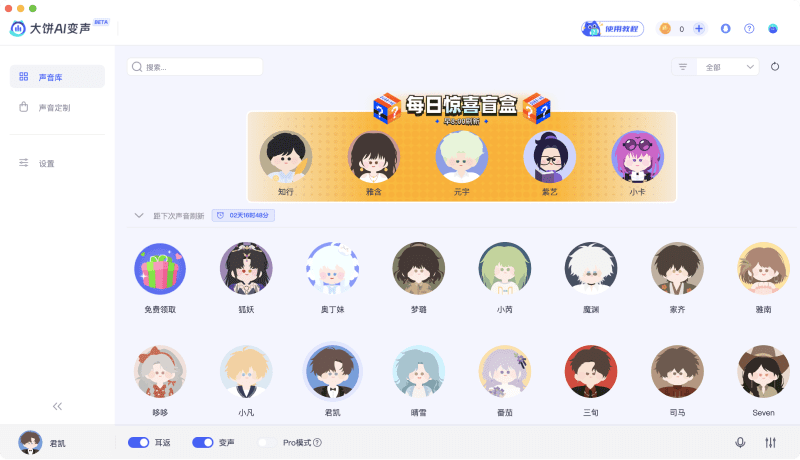 - 上百种优质音色随心选择:大饼AI变声提供丰富多样的音色,无论是萝莉音还是青叔音,你都可以随时随地更换自己的声音皮肤