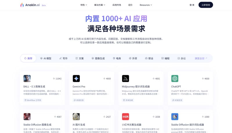 - 预构建应用:Anakin.ai提供了超过1000个预构建的AI应用,覆盖了内容生成、问题回答、文档搜索等多个领域,用户可以直接使用这些应用或根据需要进行定制。