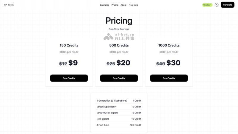 - 付费套餐:付费使用的话,Ilus AI提供不同的积分套餐,用户可以根据自己的需求和预算选择合适的套餐。具体价格为9美元150积分、20美元500积分、30美元1000积分。