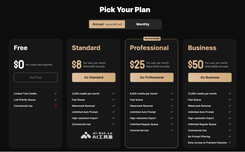 - 专业版:每用户每月25美元(年度订阅则为300美元)。该计划提供的权益包括每月6000积分(在账单日期重置)、快速队列、水印去除、无限自动提示、高分辨率导出、无限常规队列和商业使用权。技术支持的响应时间更快,为2个工作日内。